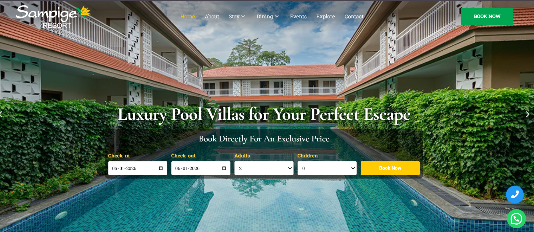 Sampige Resort is a 4-star property that delivers a 5-star experience. Nestled in Mudbidri near Mangalore, it offers 36 luxuriously appointed rooms—including 12 stunning pool villas with direct water access—set amidst serene landscapes.